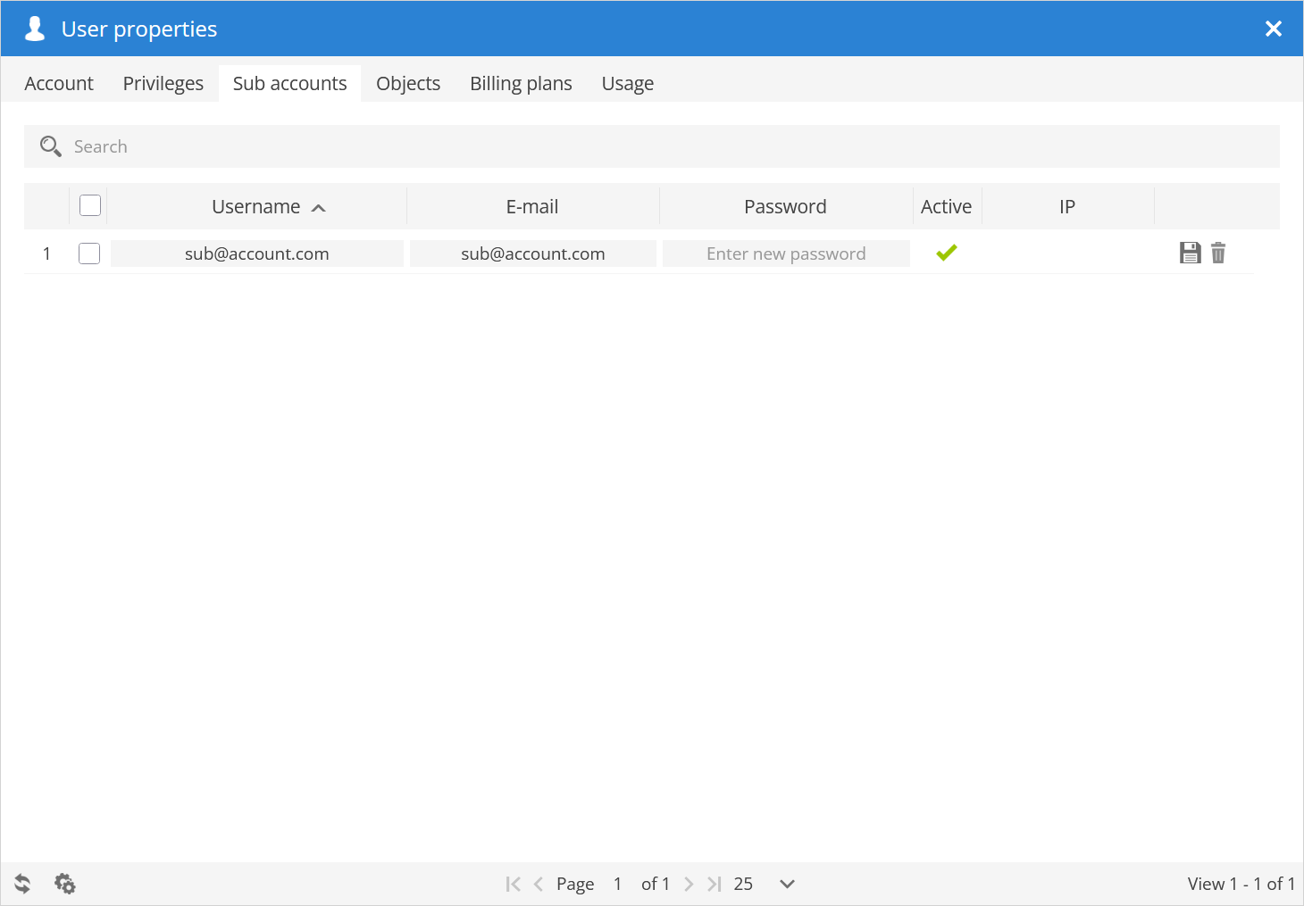 Password - allows administrator to change password of the Sub-account.